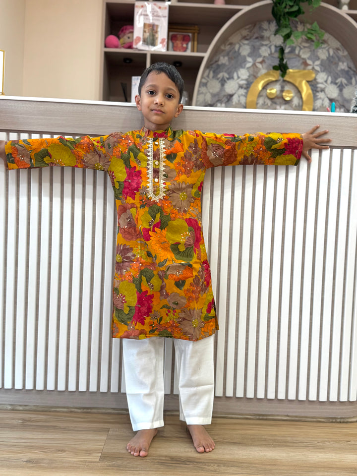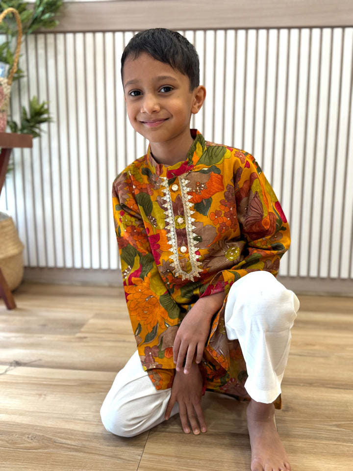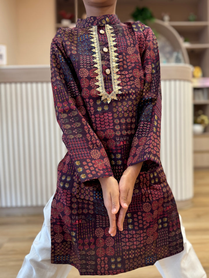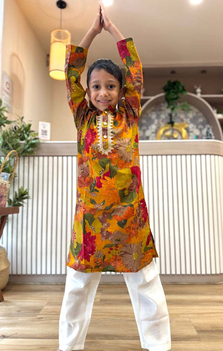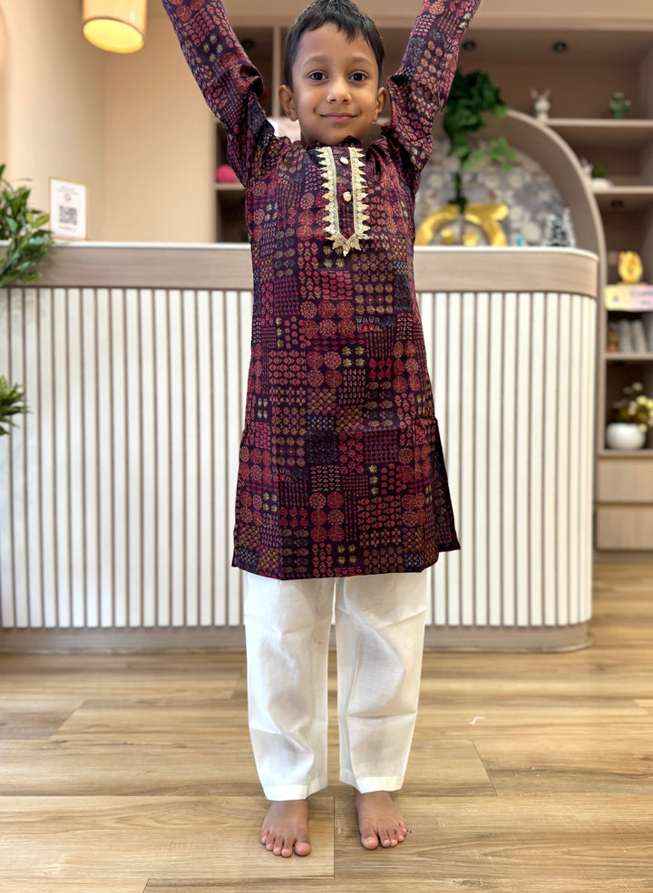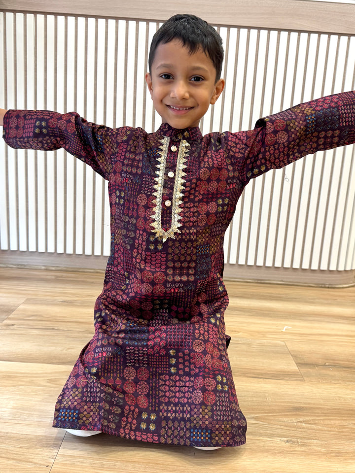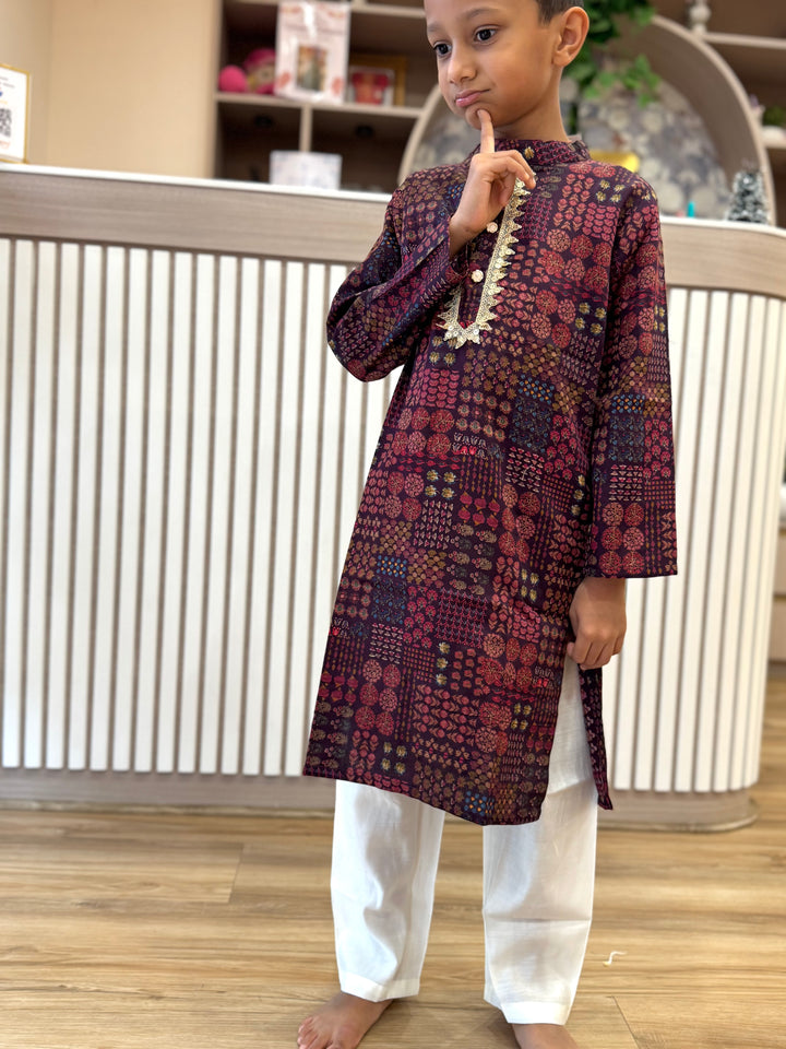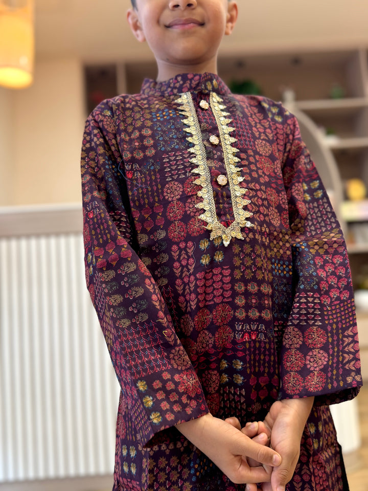 The luxurious sheen and texture of silk elevate the outfit, making it a popular choice for creating a regal and sophisticated look. This elegant traditional outfit, perfect for festive occasions, weddings, and other formal events. Smart Ethnic wear for your little boys.