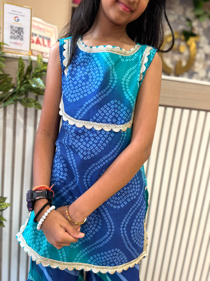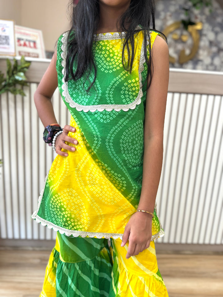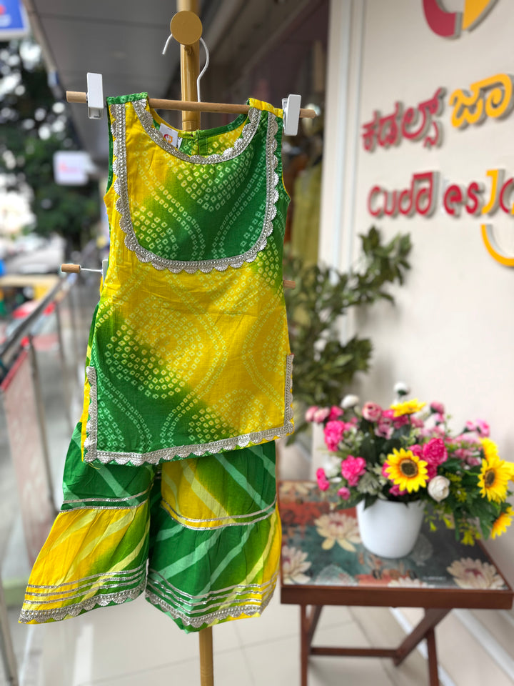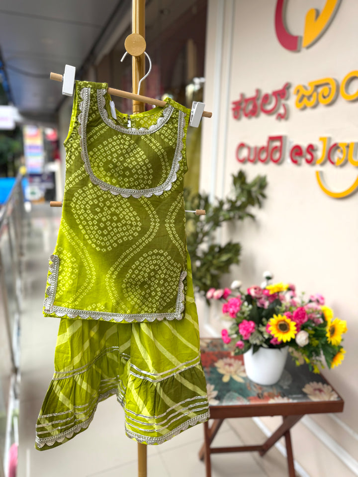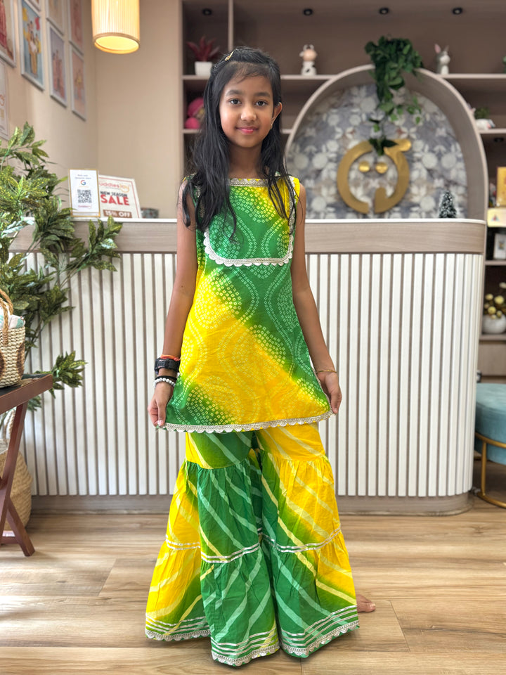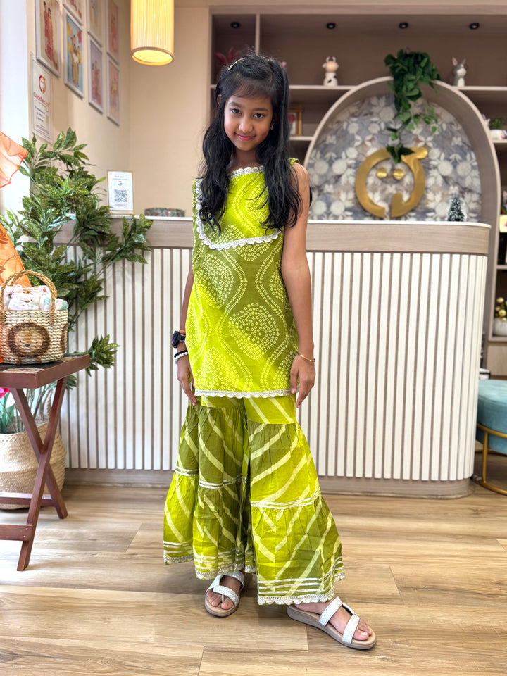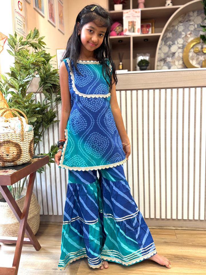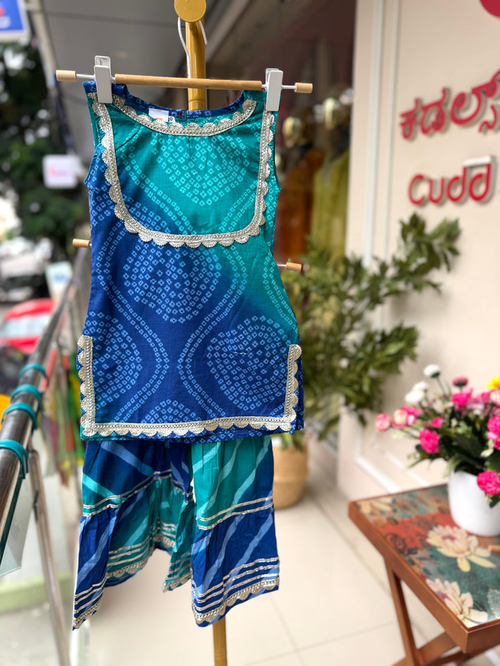 The Kurti showcases beautiful lace detailing, while the sharara flows with a rich traditional motif, inspired by regional prints. This dress adds a touch of ethnic grace to your little one's wardrobe.