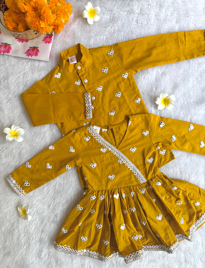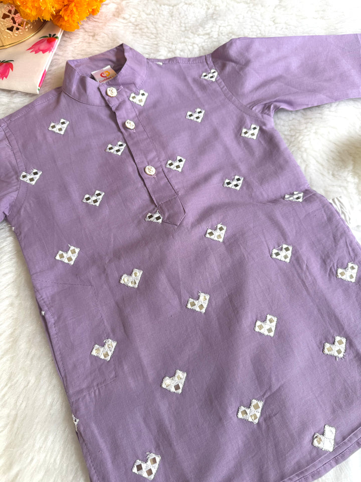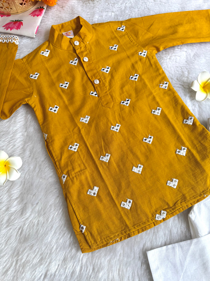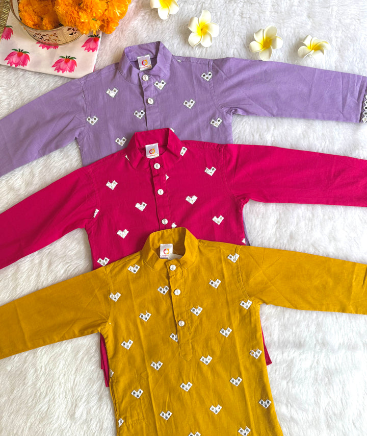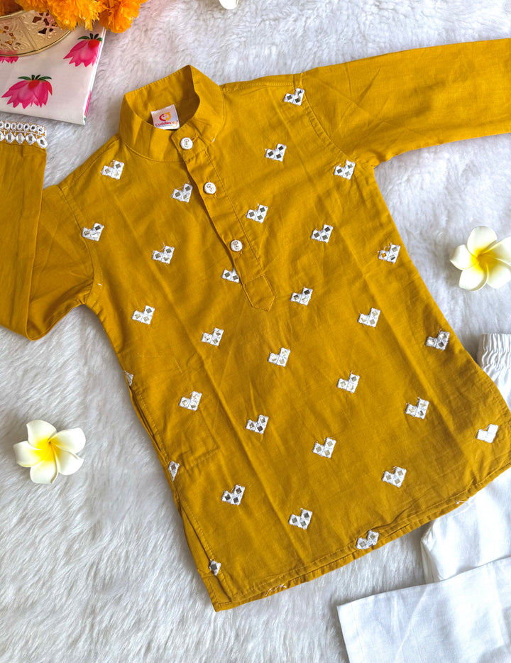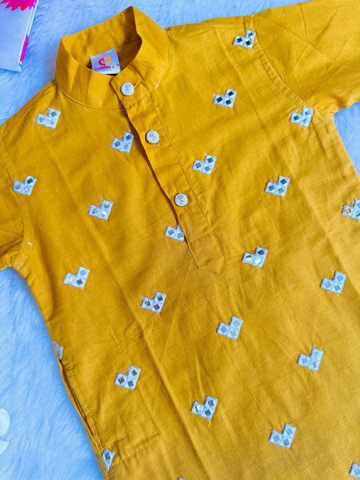 The luxurious sheen and texture of fabric elevate the outfit, intricated with beautiful mirror embroidery on kurtas, making it a popular choice for creating a regal and sophisticated look. This elegant traditional outfit, perfect for festive occasions, weddings, and other formal events. Smart Ethnic wear for your little boys.