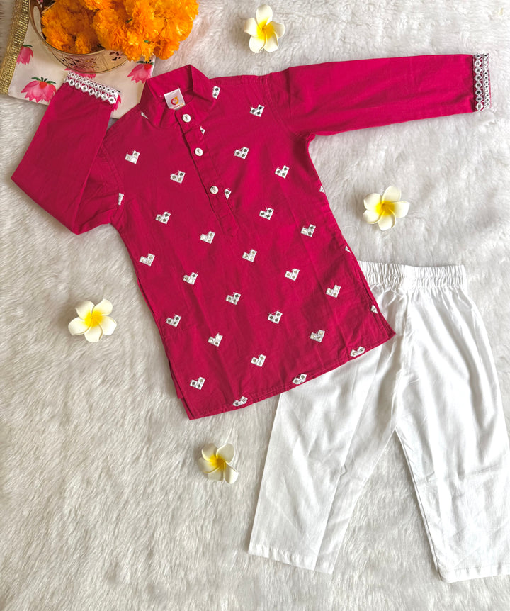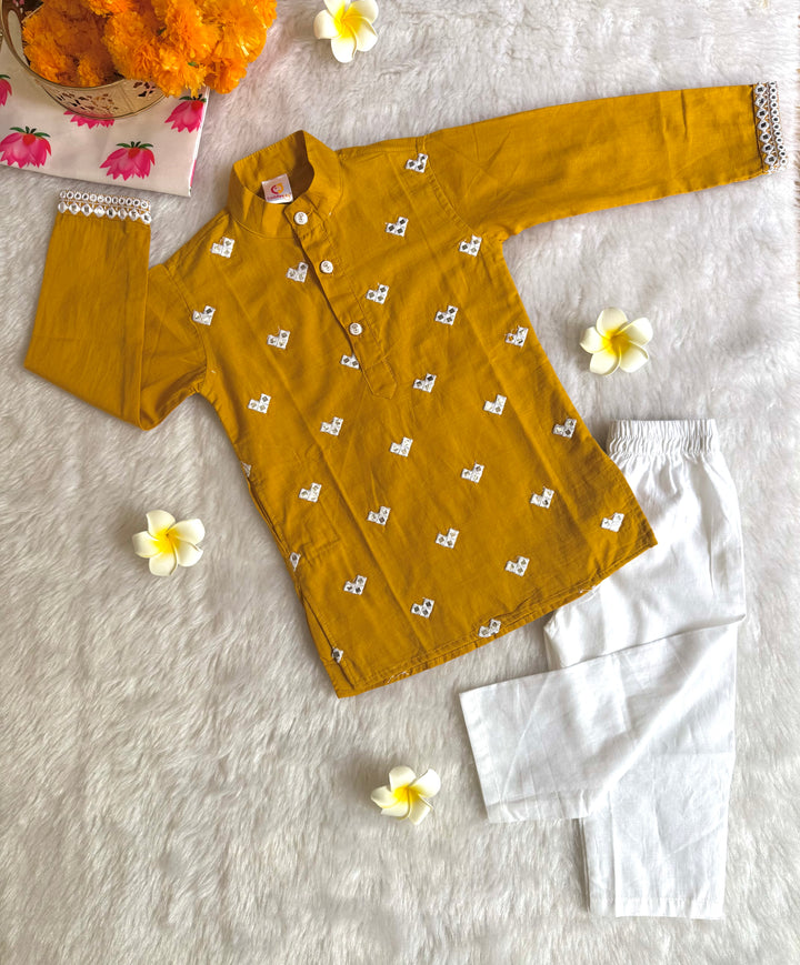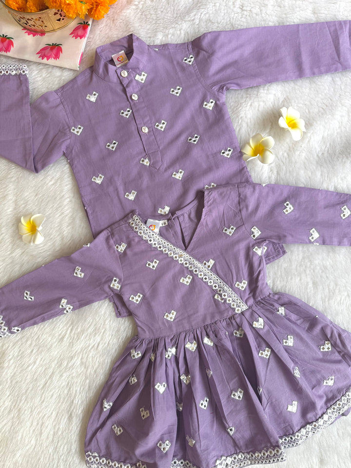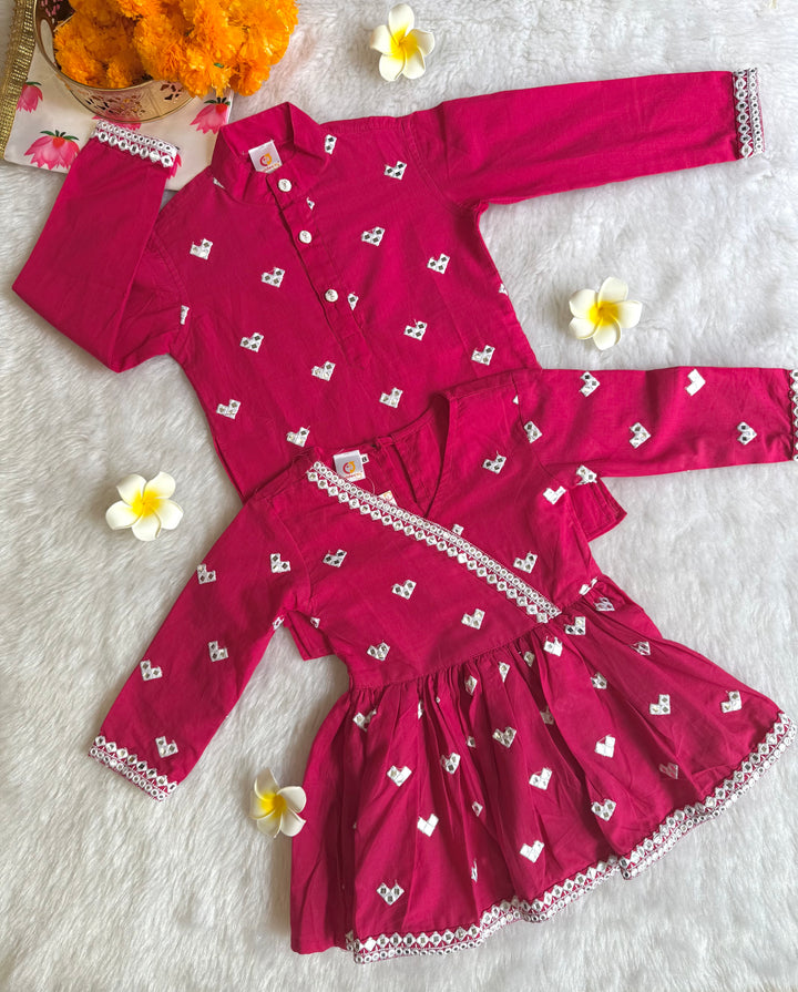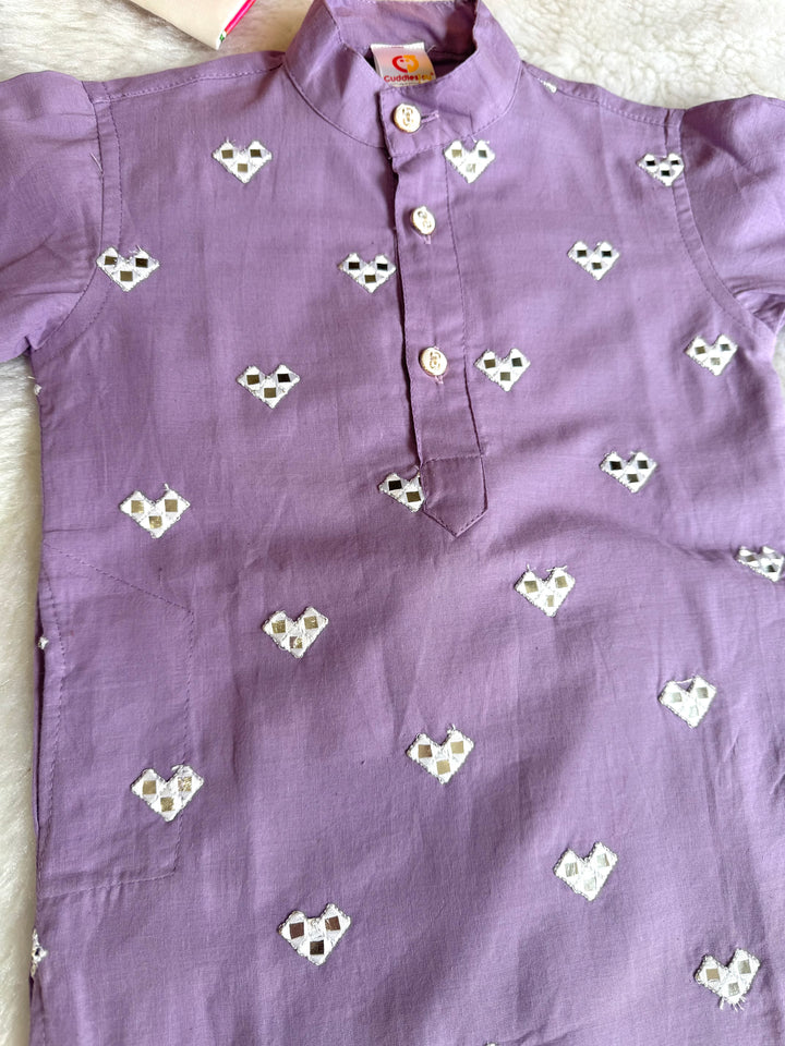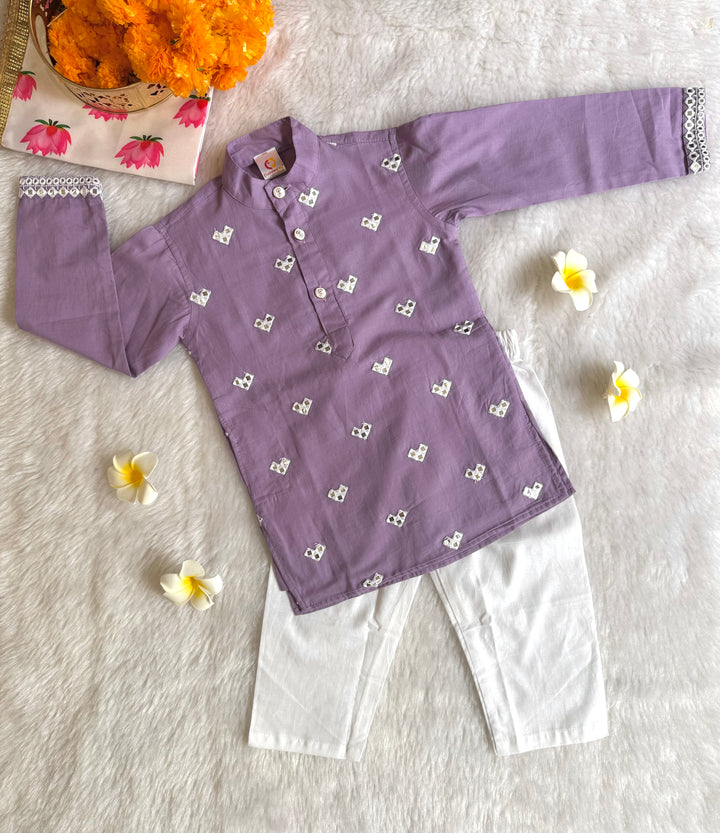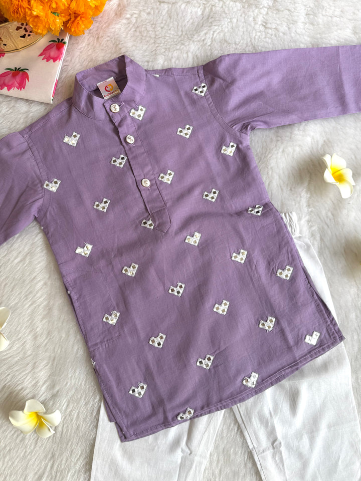 The luxurious sheen and texture of fabric elevate the outfit, intricated with beautiful mirror embroidery on kurtas, making it a popular choice for creating a regal and sophisticated look. This elegant traditional outfit, perfect for festive occasions, weddings, and other formal events. Smart Ethnic wear for your little boys.