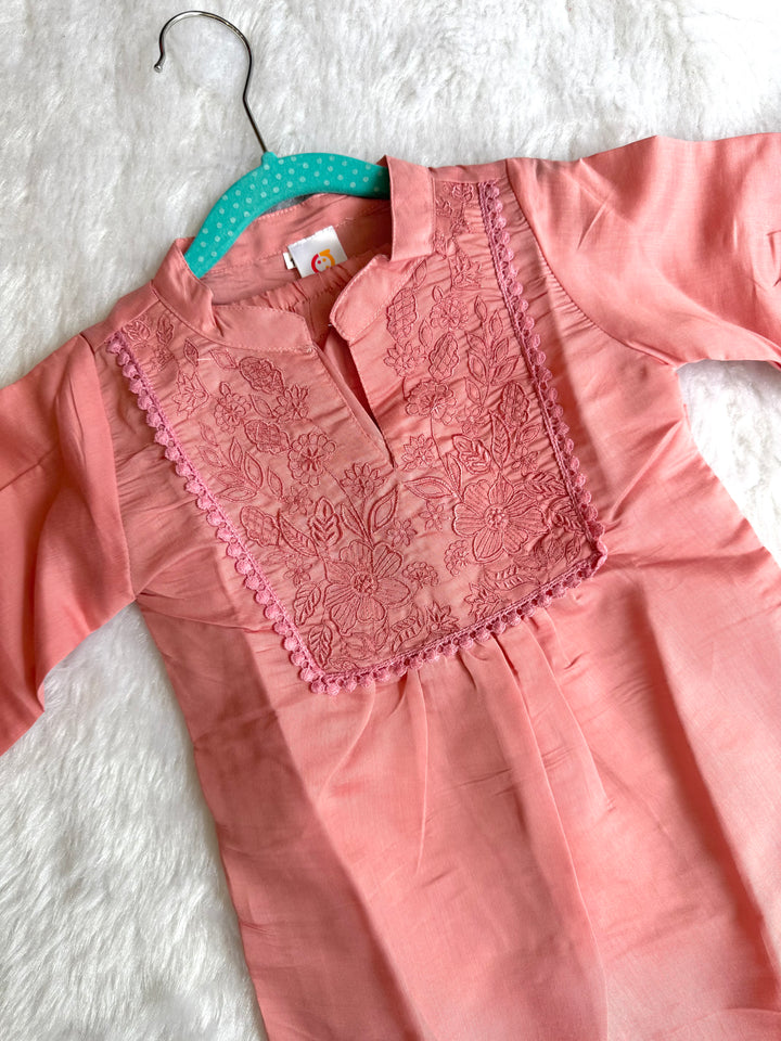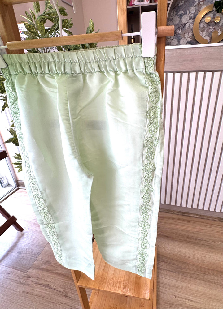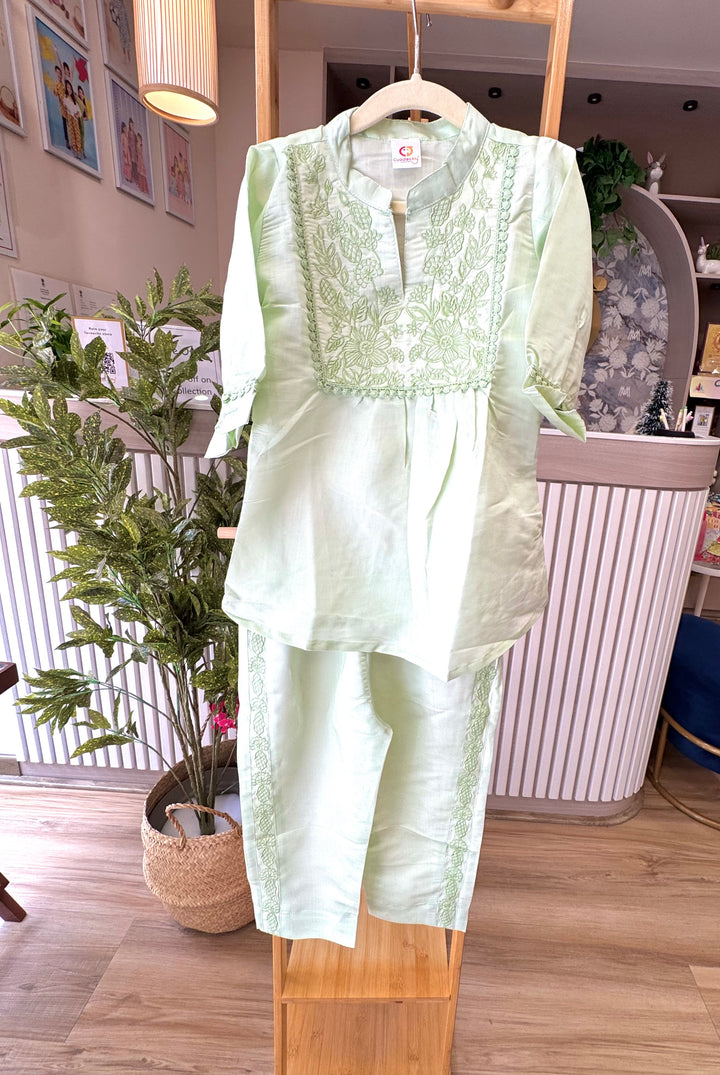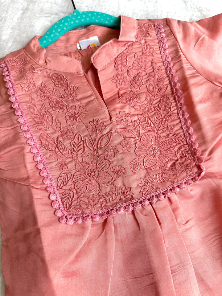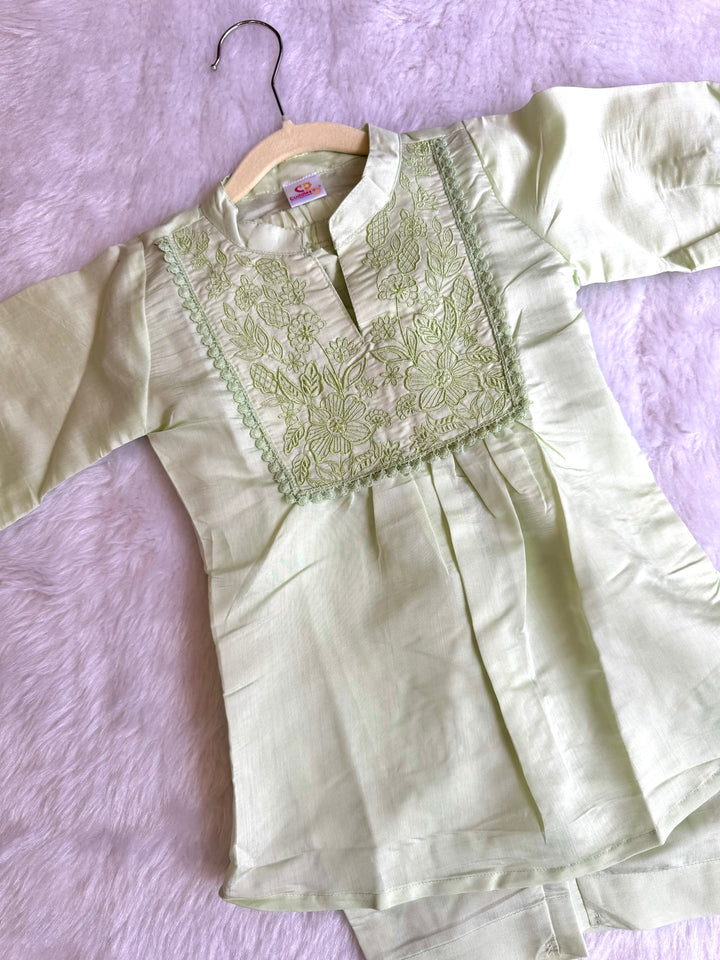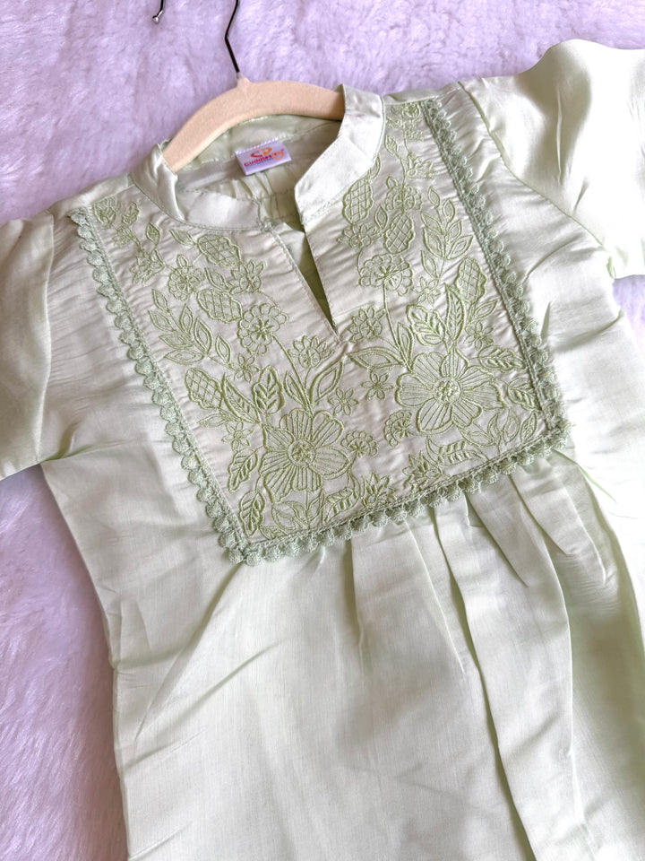 This enchanting festive dress is spun from whispers of glitters and hints of stardust. With its soft, flowing layers and delicate gloss, it dances with every step your little one takes. The bodice glows with fine thread embroidery and just a touch of gloss in the fabric. Whether she's celebrating under fairy lights or candle glow, this dress makes her feel like magic in motion.