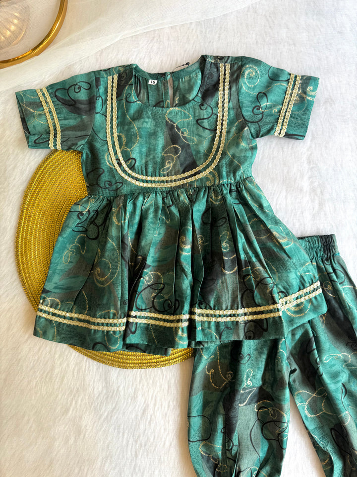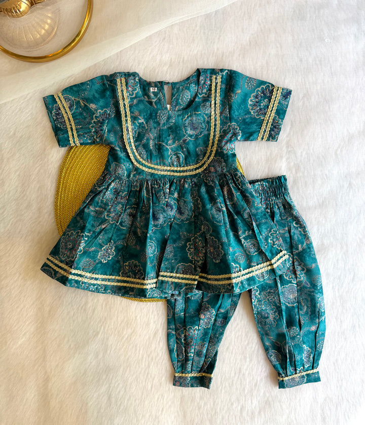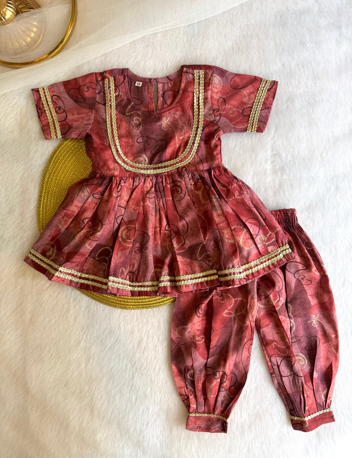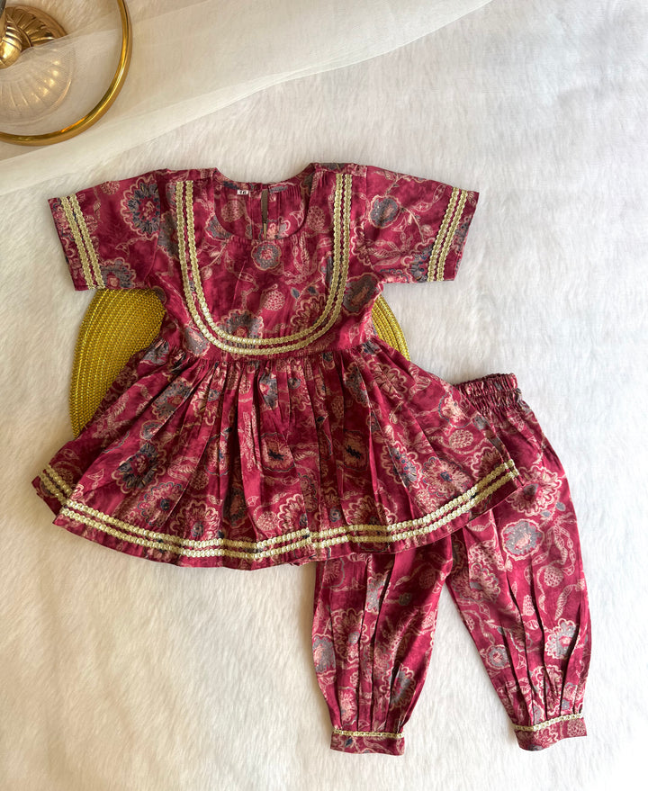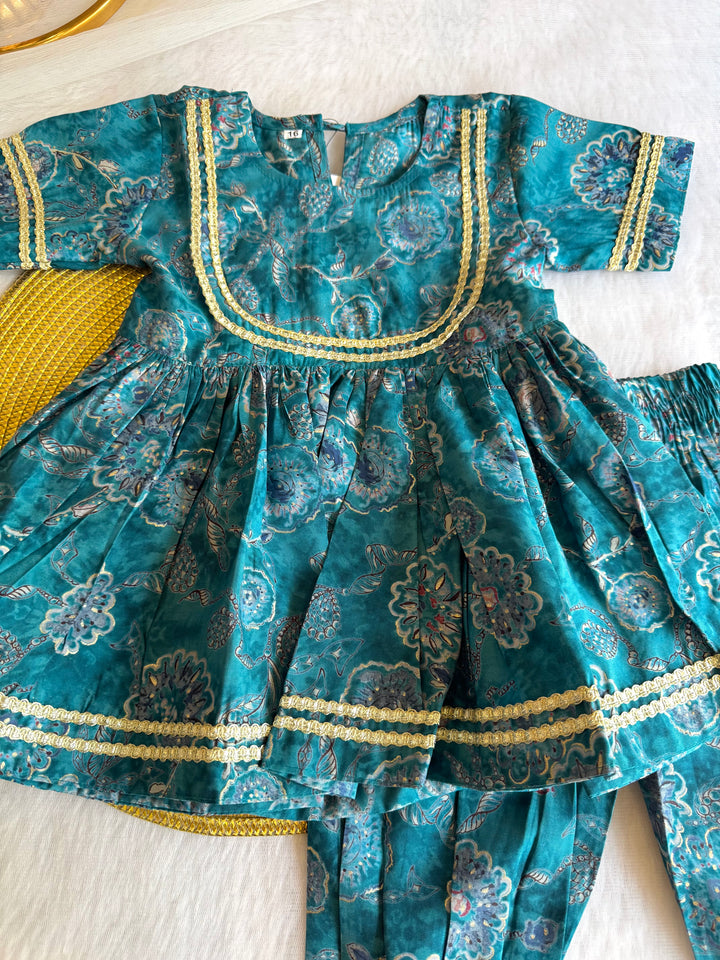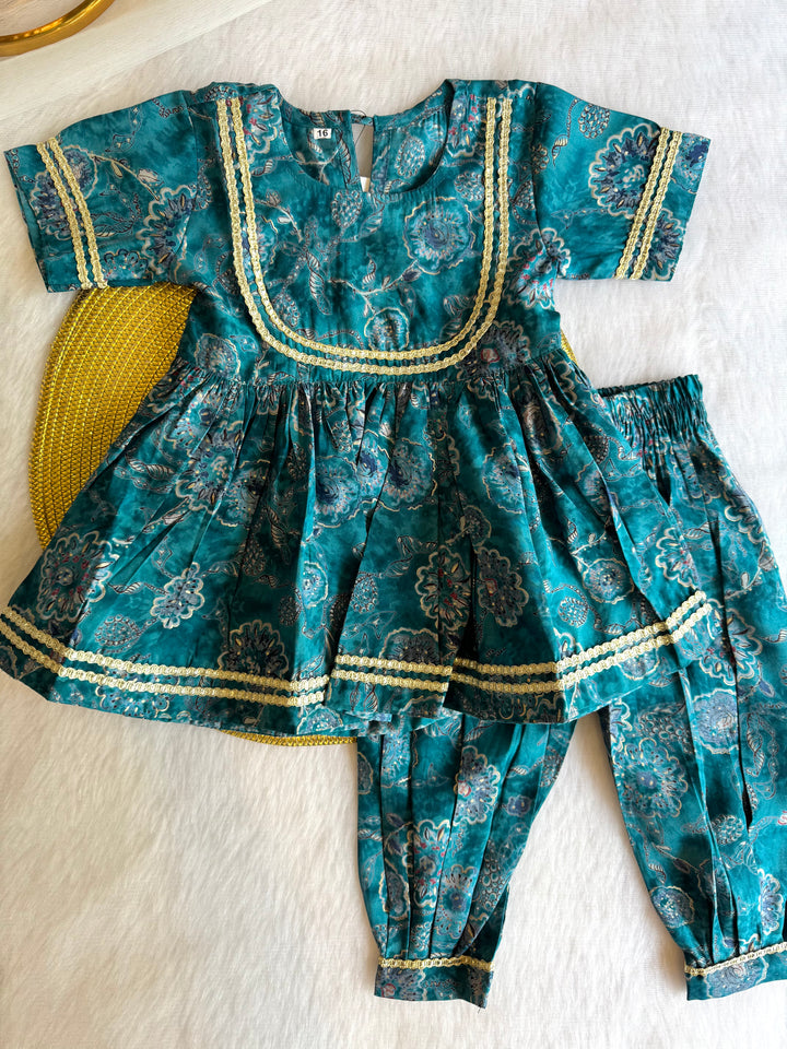 The silky touch and feel of our gorgeous ethnic sets will make your girlie look pretty and elegant. Dress up your doll with this beautiful piece. Our stylish printed kurti set features ethnic printed kurti designed with simple yet elegant neckline and a afghani pant with gottas . This graceful style will make her look gorgeous. It can be worn on festivals or family functions or casually.