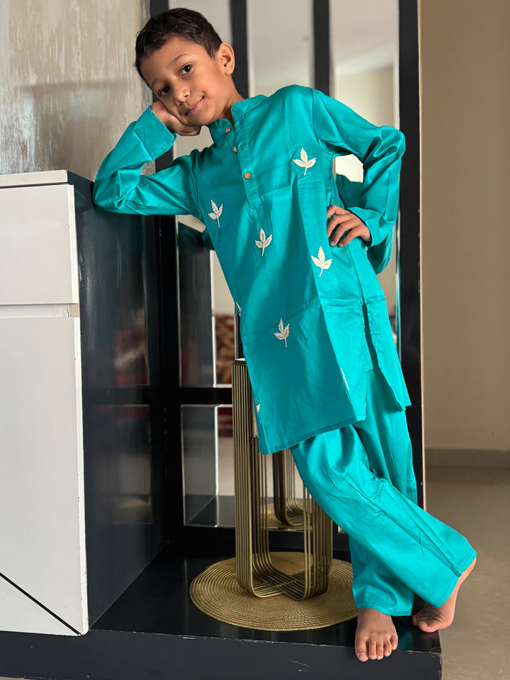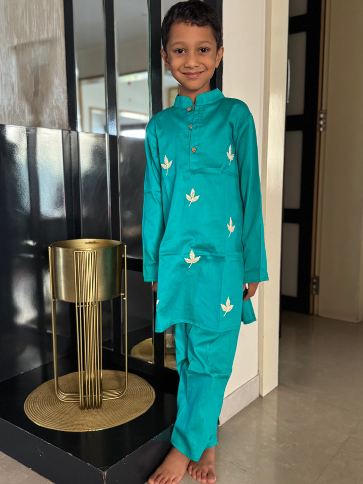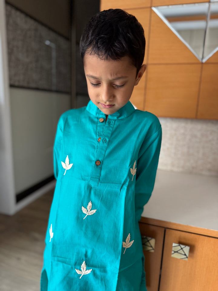 Smart Ethnic wear for your little boys with attached jacket flap. Ethnic motifs Printed Kurta with elastic white pants . This Handsome Set can be worn on occasions, family functions.