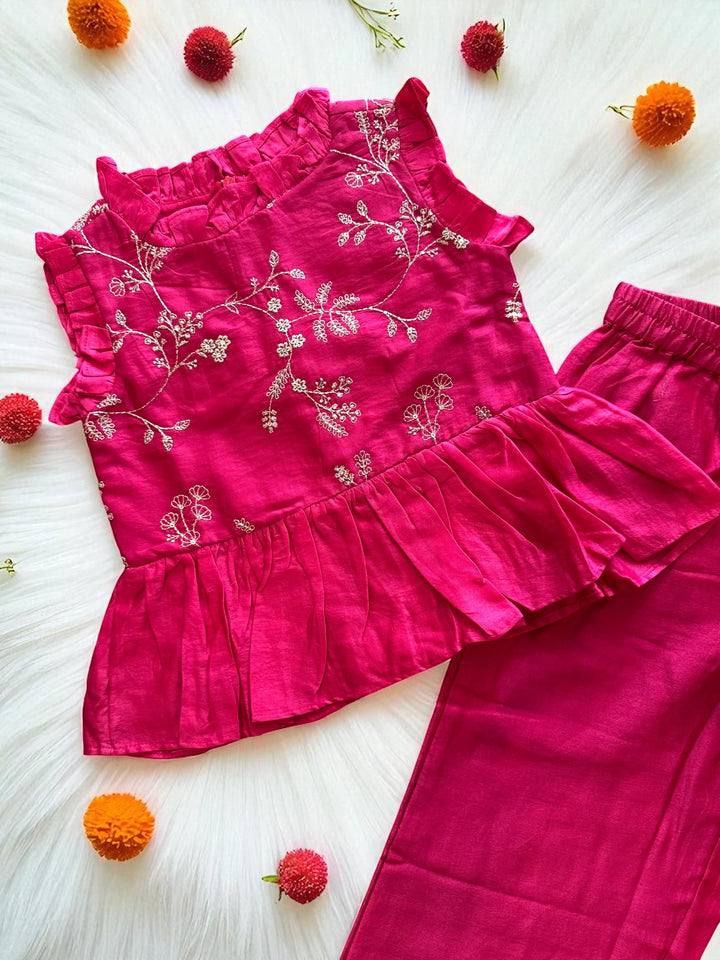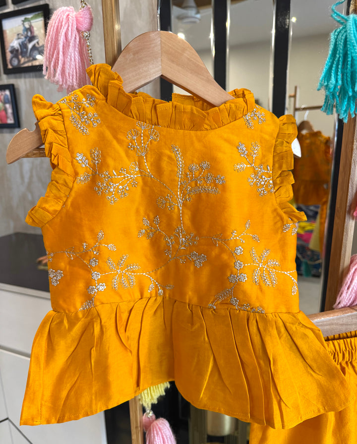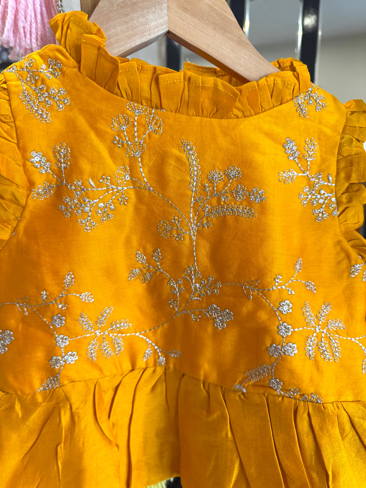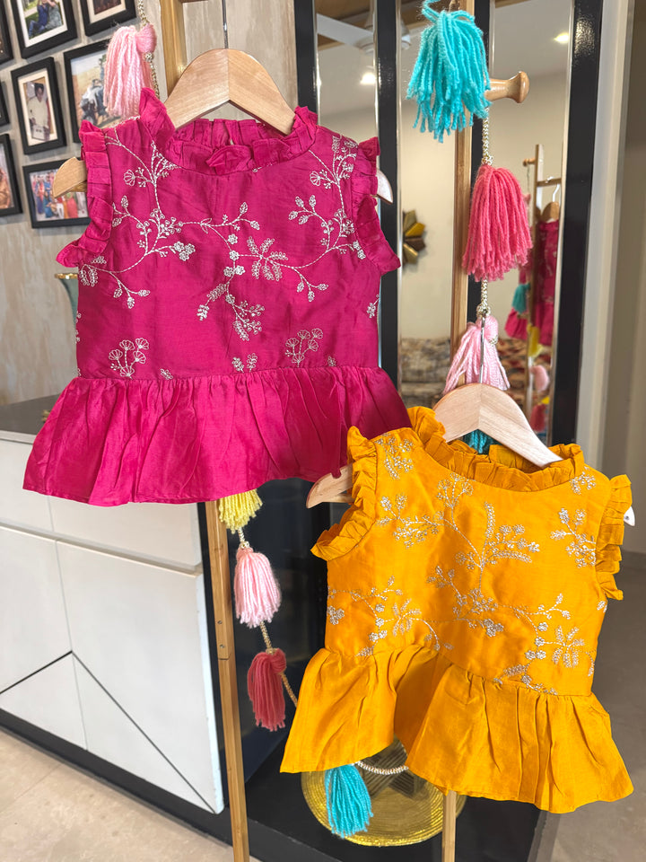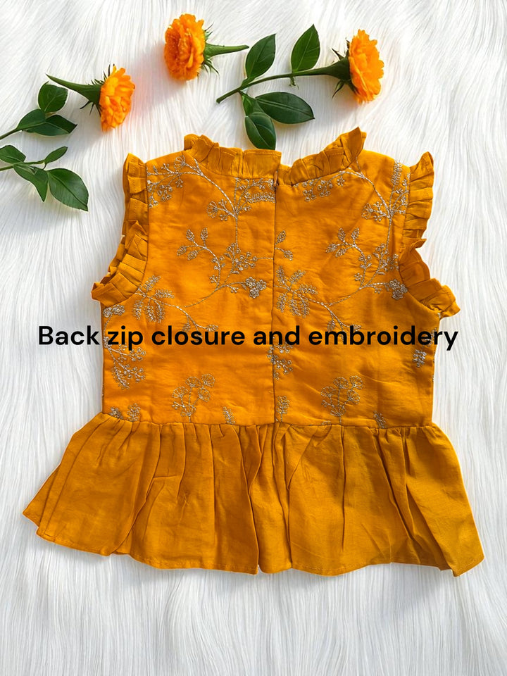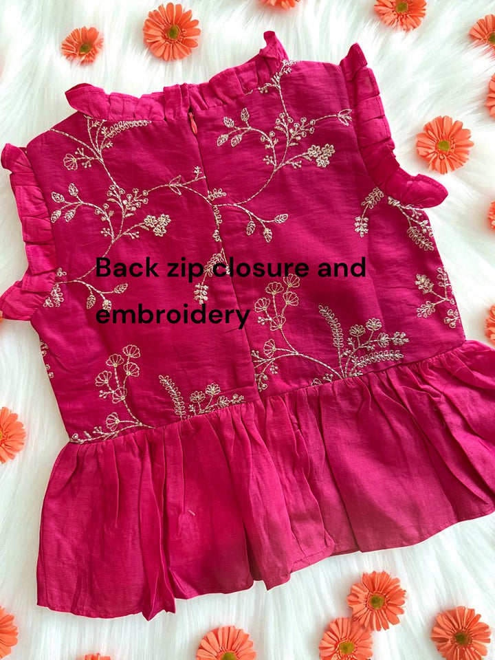 Top has a frill neck style followed by frill on the top hem , with back zip closure and super fine detailing of embroidery all over. Top has soft Mul cotton lining inside.