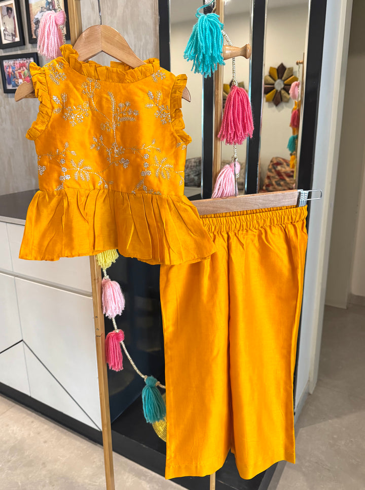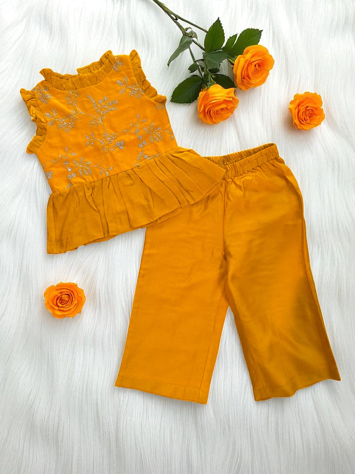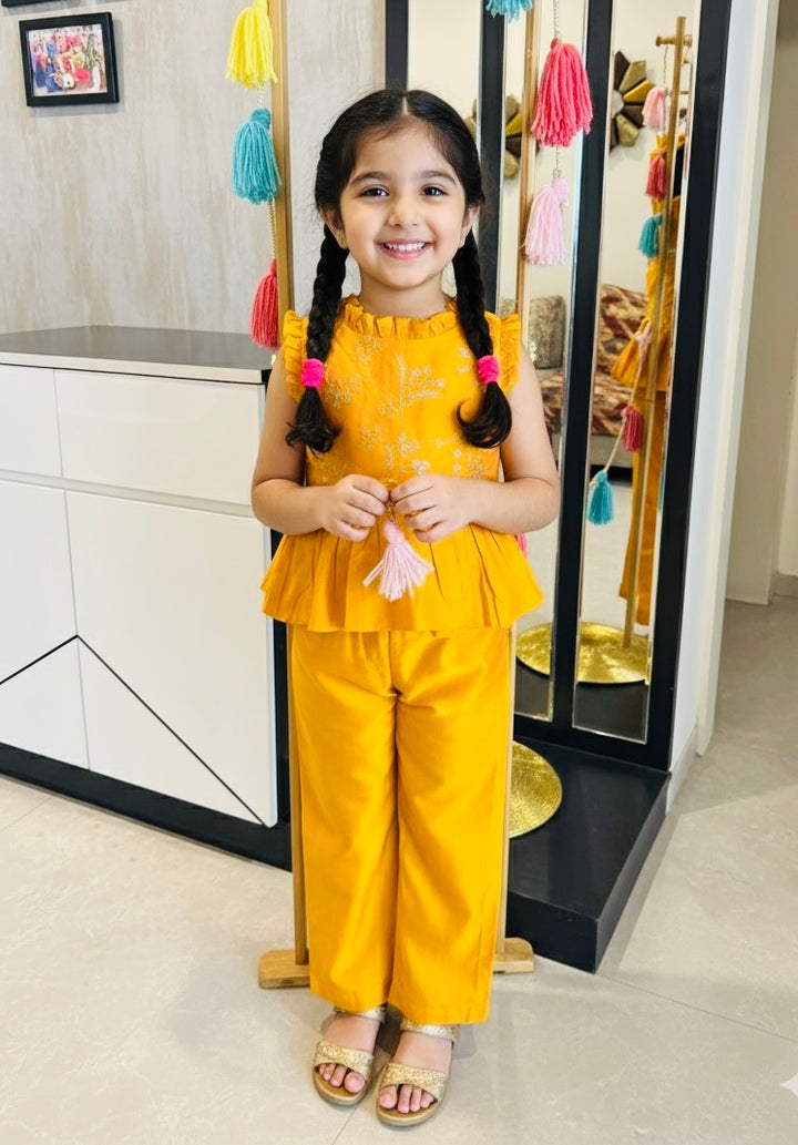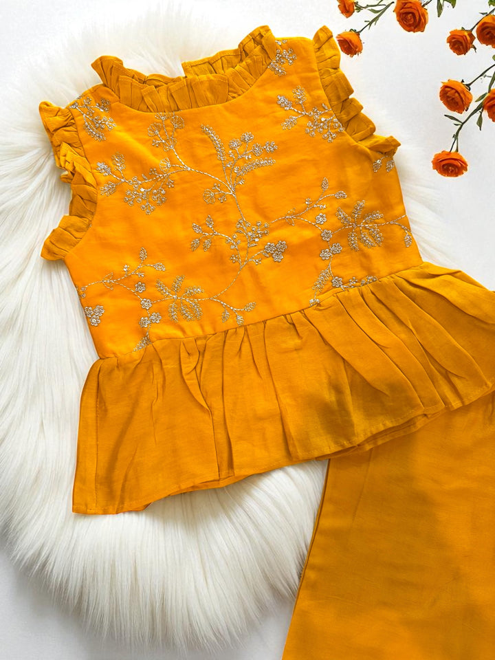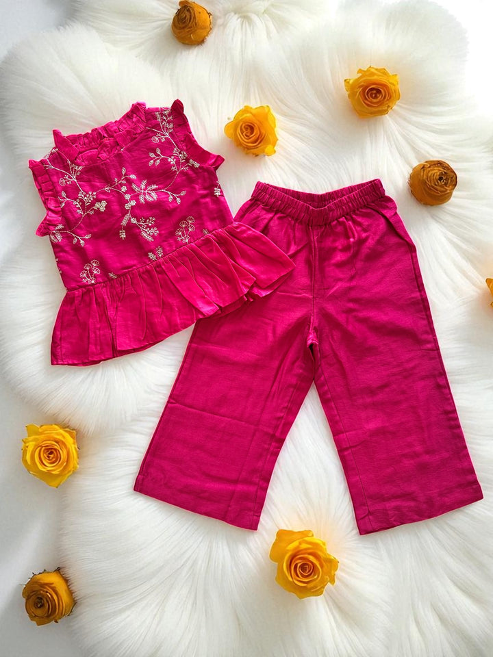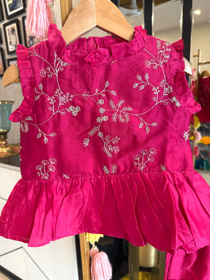 Top has a frill neck style followed by frill on the top hem , with back zip closure and super fine detailing of embroidery all over. Top has soft Mul cotton lining inside.